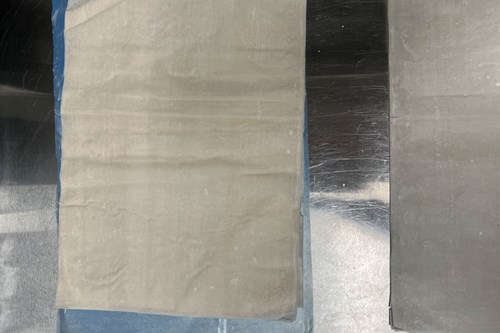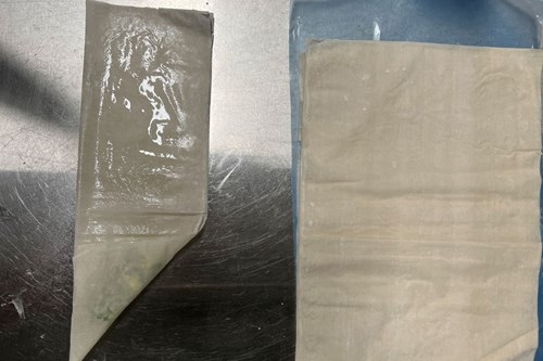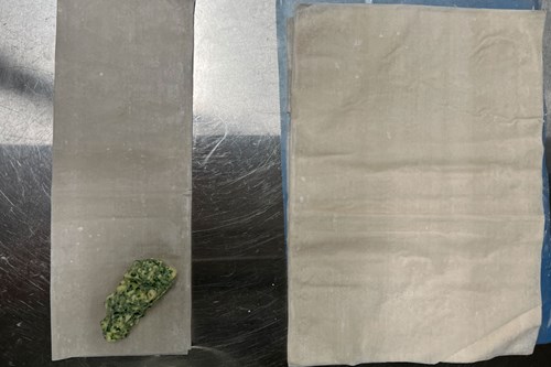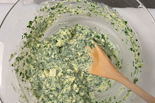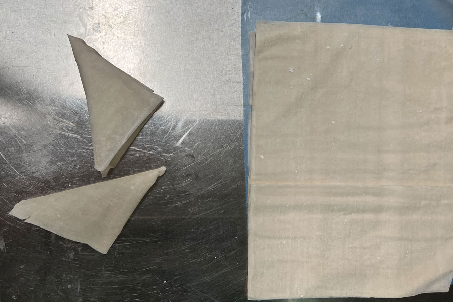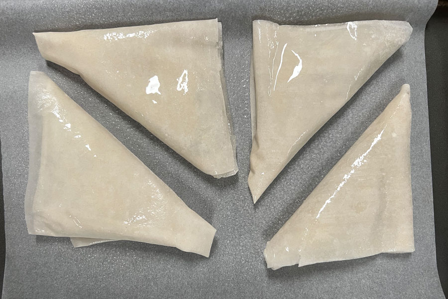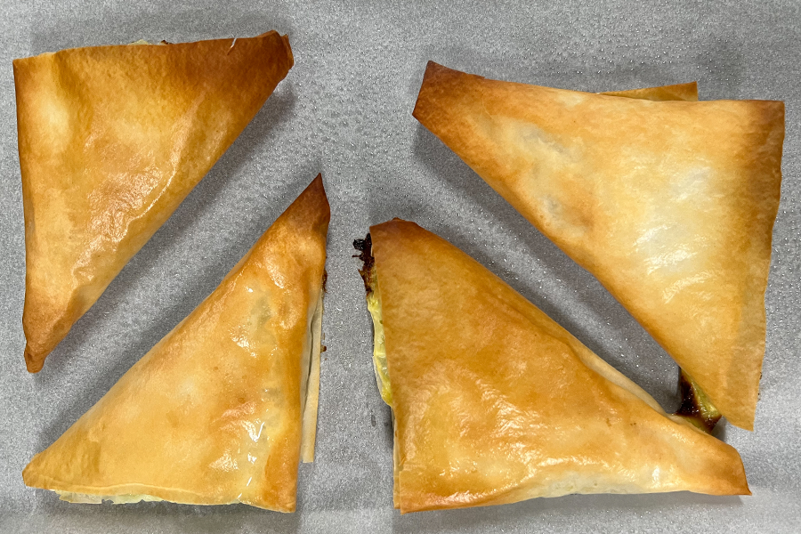 Then fold the corner of the filo sheet with the mixture on it over itself to form a triangle.