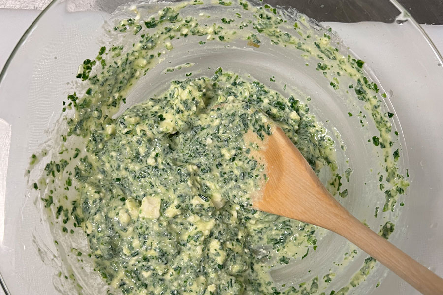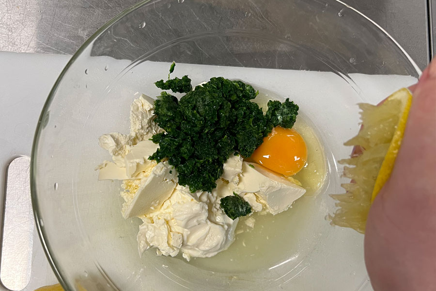 Place 2 tablespoons of the spinach and ricotta mixture in the top right-hand corner of pastry