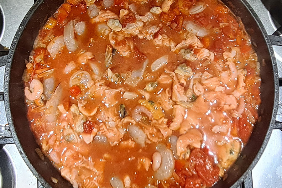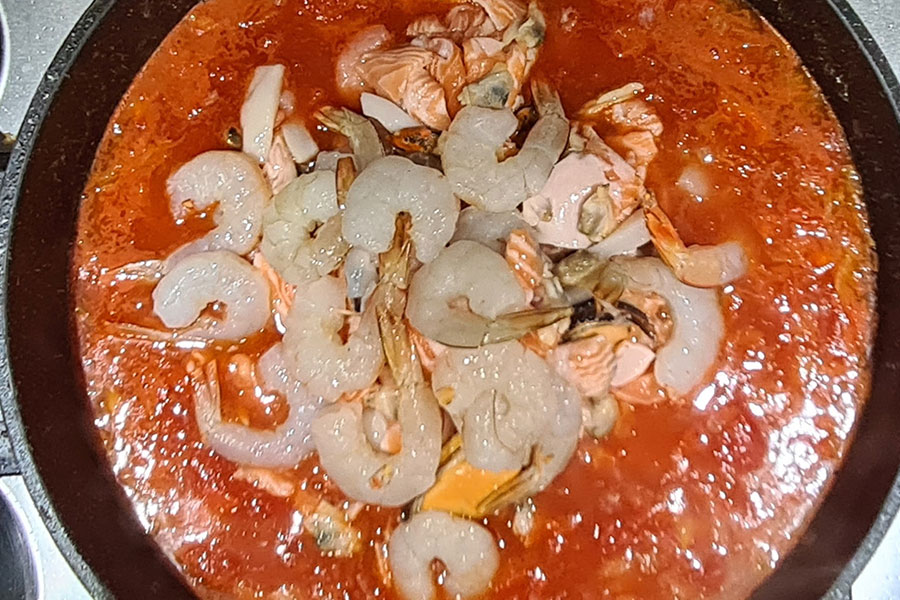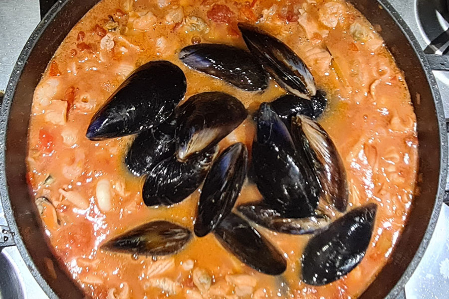 - Place lid on, simmer for 3 mins or until mussel shells open.