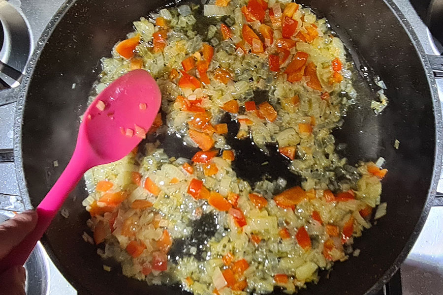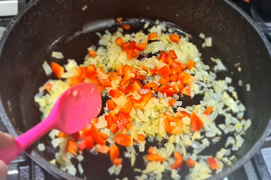 Add ½ diced red capsicum, cook and stir for 2 minutes.