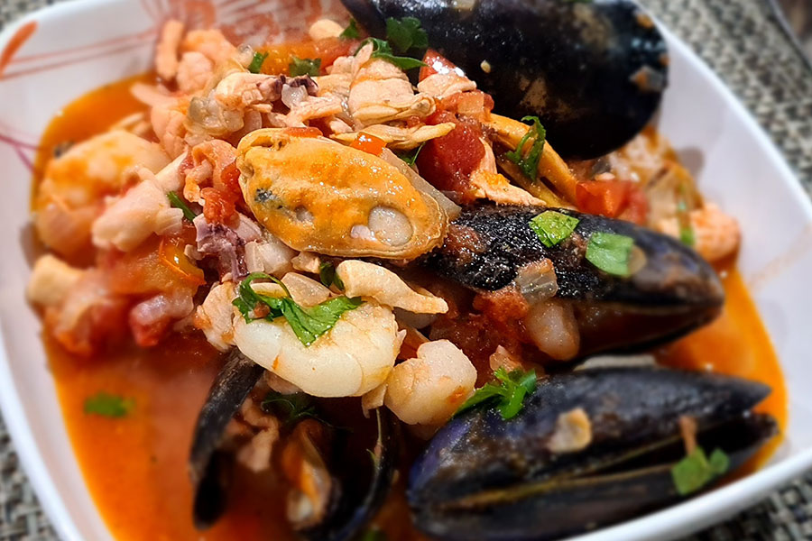Divide seafood stew between 2 large bowls. Top with ½ cup parsley and ¼ cup parmesan.