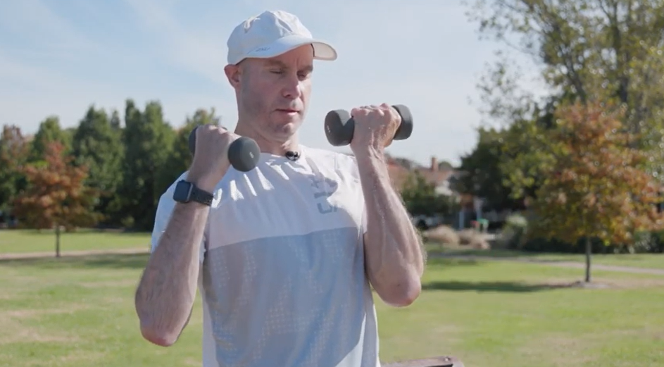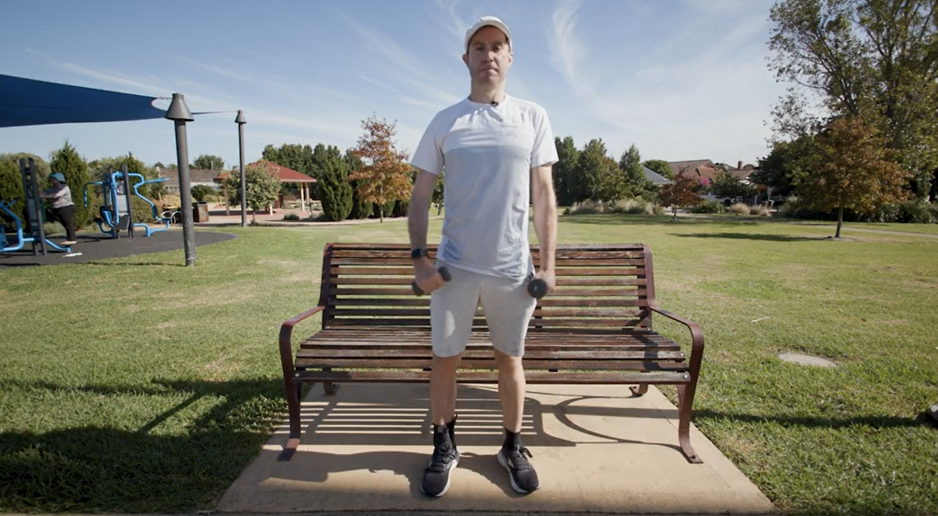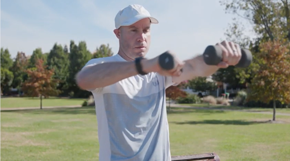 Alternate between standing up exercise with weights which you do fast and the standing exercise with weights at normal speed for a total of 5 minutes